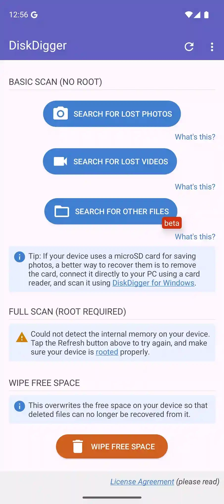 DiskDigger permite recuperar rápidamente fotos, vídeos, documentos y otros archivos que no sean multimedia eliminados en tu dispositivo Android. Es gratuito y permite restaurar fotos, tanto si se borraron accidentalmente como si se encuentran en la memoria interna o en la tarjeta SD. Está disponible oficialmente para dispositivos Android y puedes descargarlo directamente desde Google Play Store .