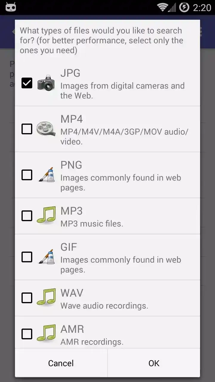 Esta es otra característica clave, ya que permite a los usuarios acceder a los archivos que necesitan sin complicaciones. Solo tienes que hacer clic en el icono de engranaje para abrir «Opciones» y filtrar los archivos recuperables según su tamaño, tipo, etc. También puedes establecer un tamaño mínimo para los archivos disponibles marcando la casilla junto a «Tamaño mínimo de archivo» e introduciendo el número mínimo de bytes. La aplicación ofrece un tamaño mínimo para las fotos recuperables por defecto y permite filtrar la mayoría de las demás imágenes.